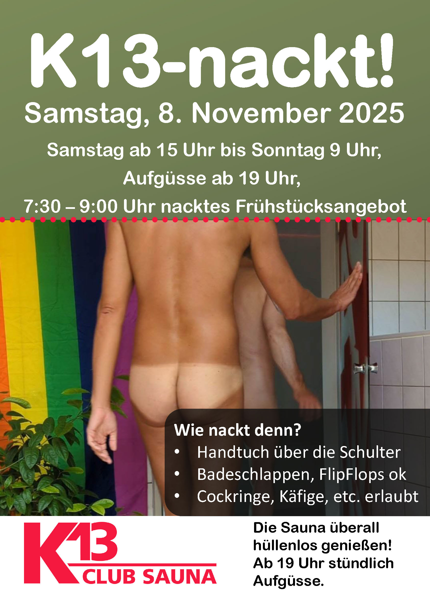 Die K13 ist die Men-Sauna in Oldenburg zur Entspannung, Erholung, Spaß und Wellness unter Gleichgesinnten. Einlass ab 18 Jahren.
